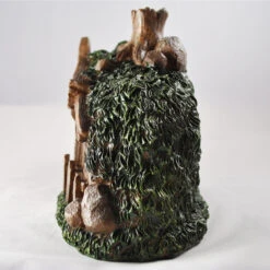 This enchanted terracotta house has an artistic fairy in mind! Emerald green roof and golden door are really quite refined. A garden with rare blue toadstools and lots of flowers too, and windows with pale green shutters, just to enjoy the view!