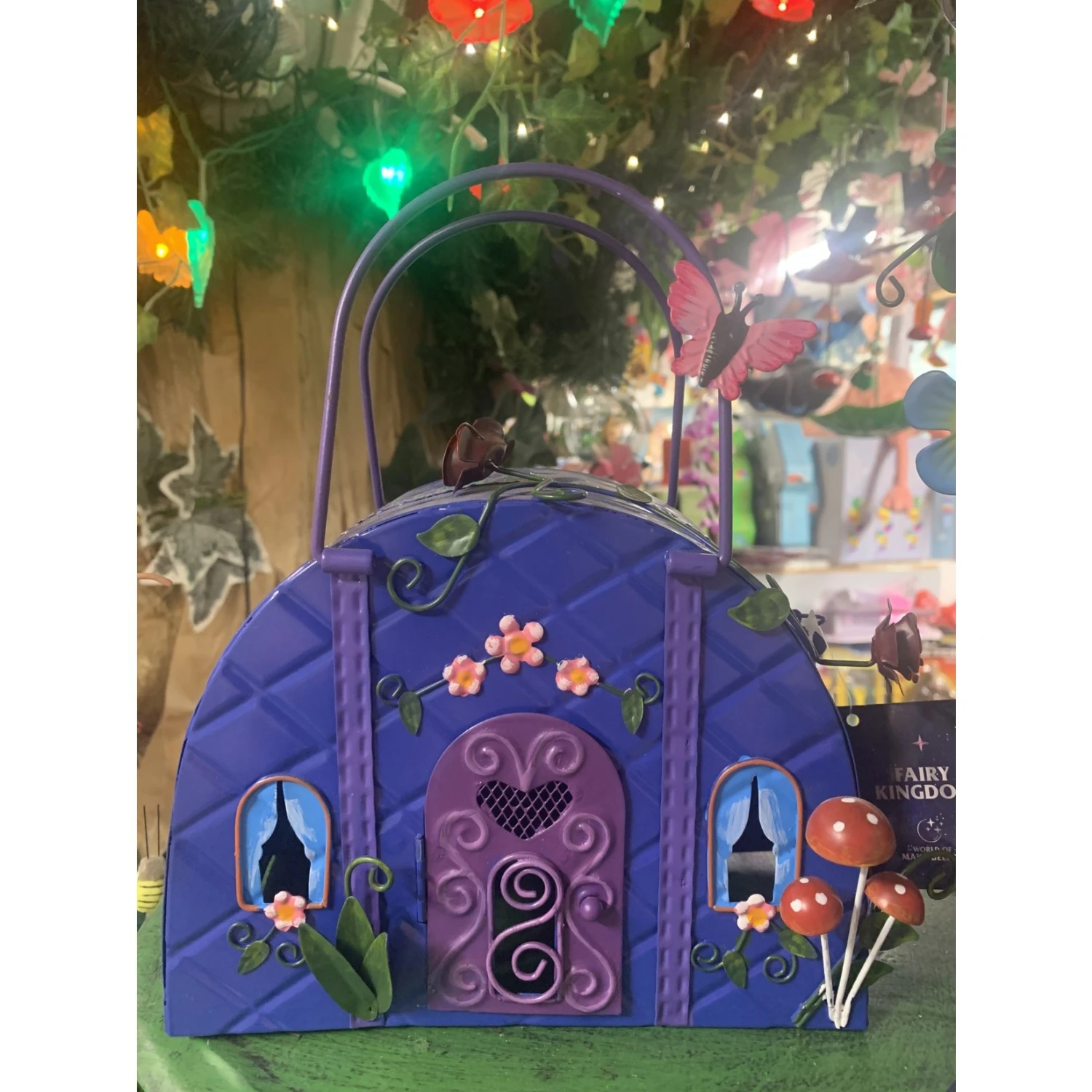 This handbag fairy house two windows at the front with a opening purple door in the middle, green metal foliage and pink & purple flowers decorate the front an side.