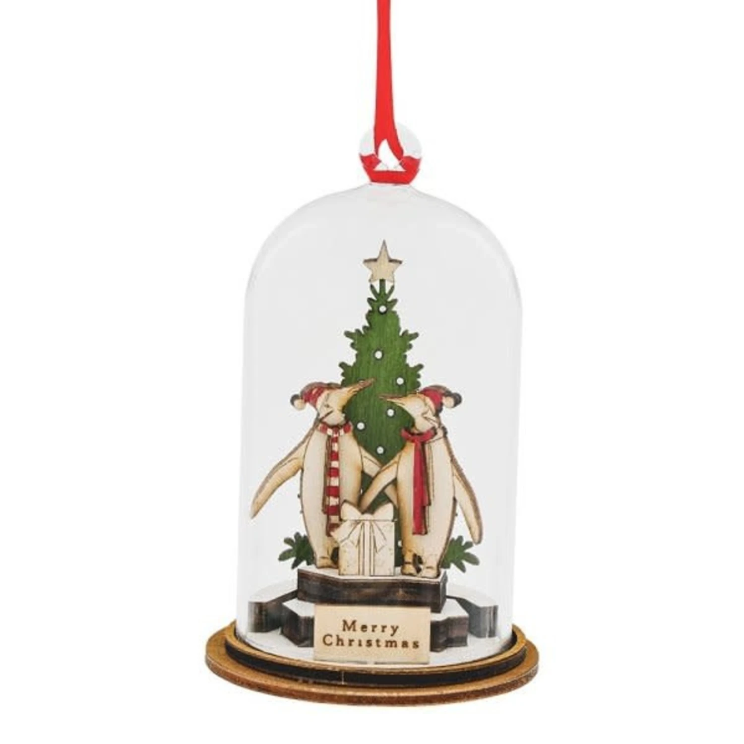 This hanging decoration features two penguins in front of a green Christmas tree and a present in the foreground.