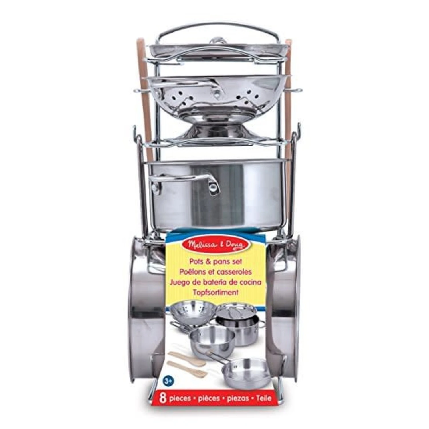 This play set features shiny stainless steel cookware Mum and Dad would envy! Generously sized (5-inch diameter) for a more realistic look and feel, the colander and three pans (with interchangeable lid) fit most play food items for exciting restaurant and kitchen play, and store neatly on a convenient storage rack when the kitchen is closed. All of the handles and knobs feature sturdy riveted joints that won’t weaken and wear like welding or glue. With two hardwood utensils included and stainless steel pieces polished to a gorgeous mirror-finish, this set is truly top shelf!
